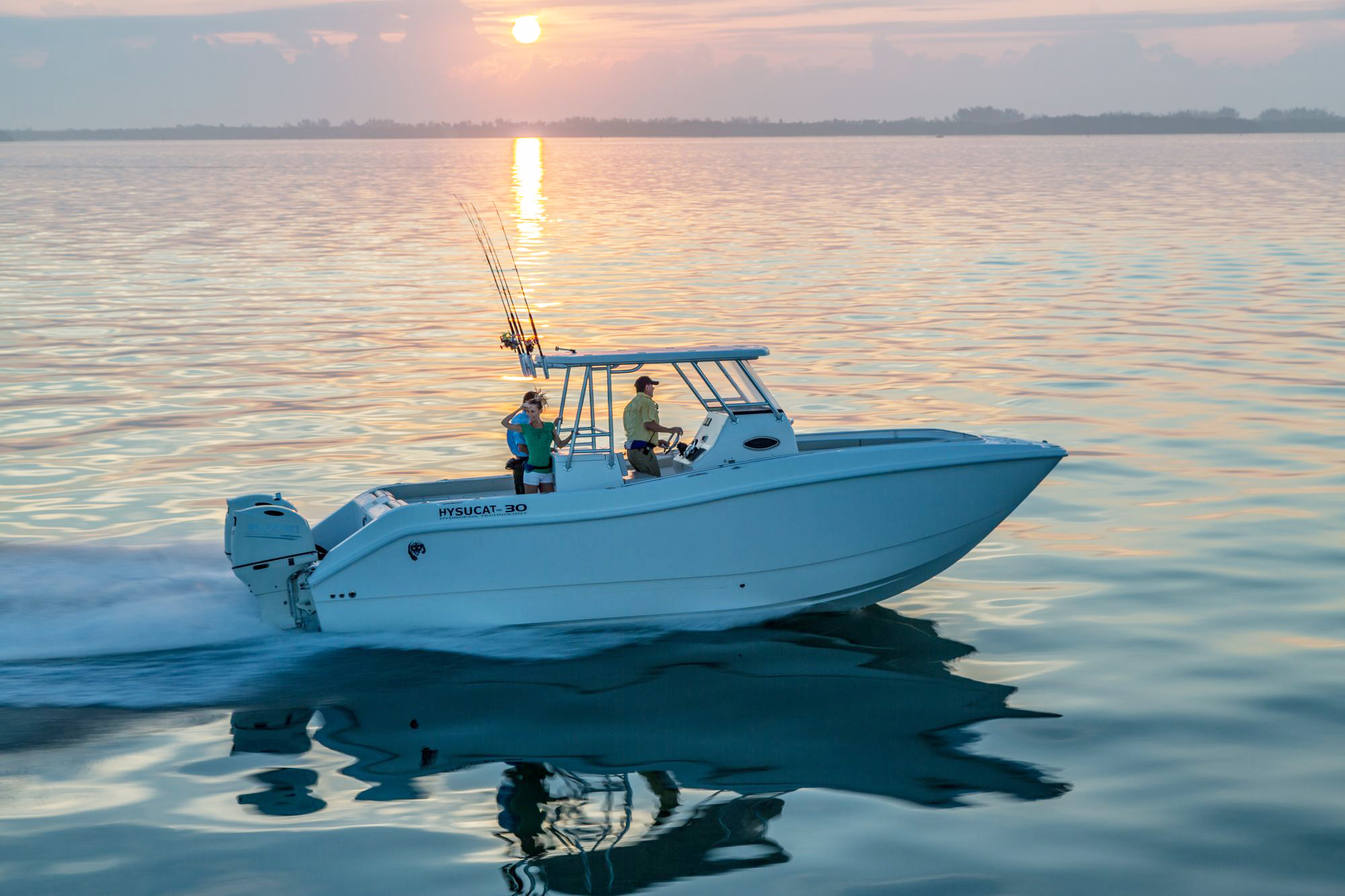 Loaded with standard features, the hysucat 30 center console combines hard-core fishing essentials with luxury and comfort. wrap-around bow seating with optional chaise lounge and removable table are great for a family day on the water. anglers will appreciate the standard fiberglass lean post, deluxe tackle center, rod holders, footrest and flip-up bolster chairs. there is plenty of storage with port and starboard insulated fish boxes/storage along with an enclosed head.
